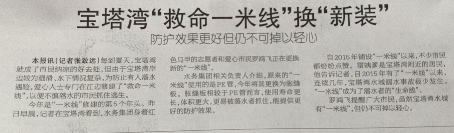 7月,长江进入主汛期,为防止荆江宝塔湾江段游人溺水身亡事件发生,7月10日,荆州水务集团青年志愿者对宝塔湾江边400米长“救命一米线”进行了维护升级。