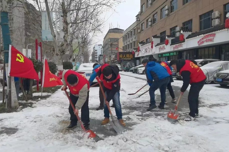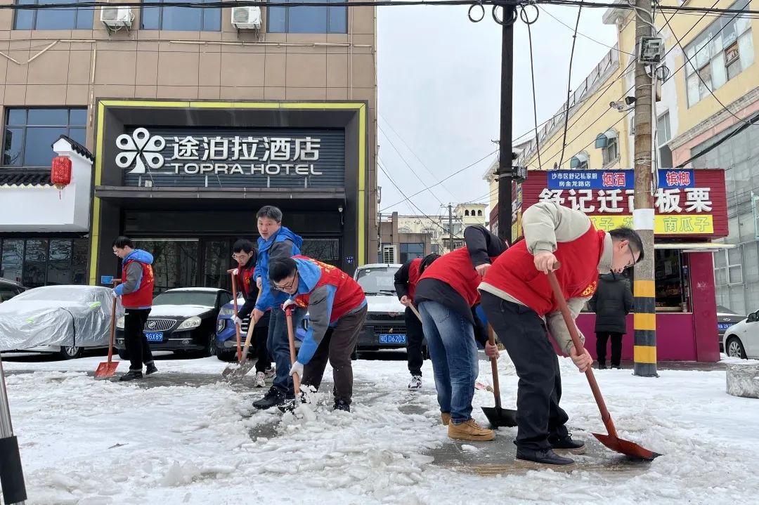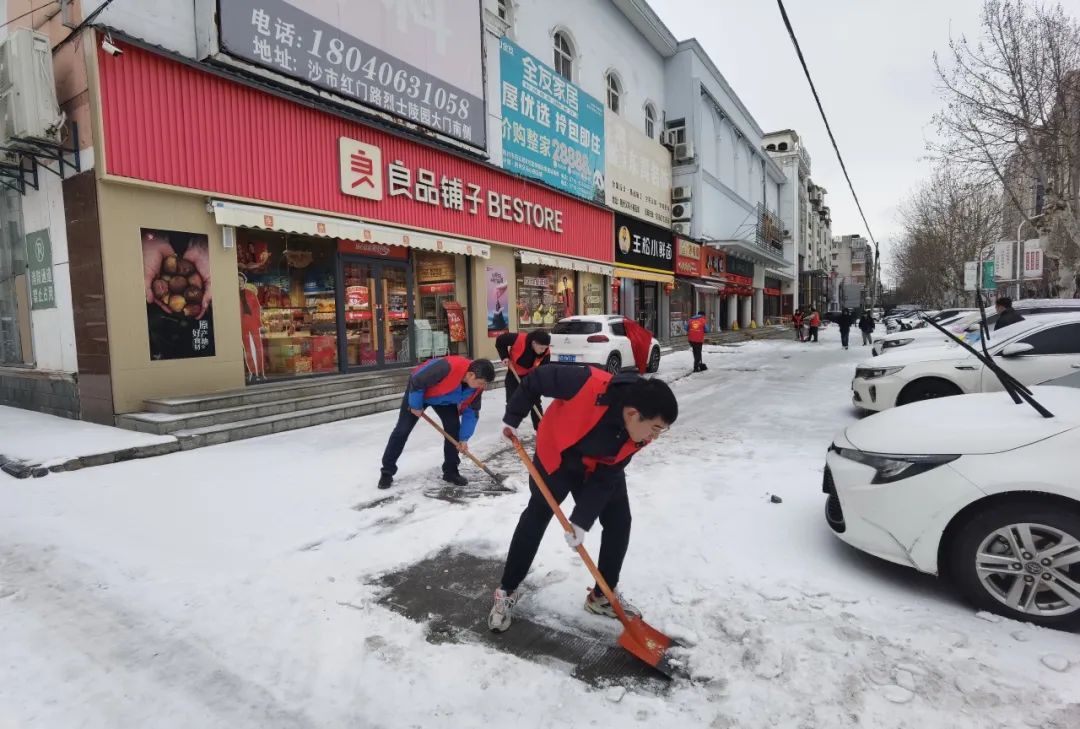由于气温较低,主干道的积雪下还有一层厚厚的冻雨层,清扫较为困难。大家不畏严寒,党员、团员冲锋在前,清除最困难的积冰路段;青年志愿者们共同携手,将铲下的积雪、碎冰清扫干净。天气寒冷,但丝毫不影响大家铲雪的热情。一个个忙碌的身影,构成了一道亮丽的风景线,让这个寒冷的初春变得格外温暖,为居民群众开辟出一条条安全出行的“绿色通道”。