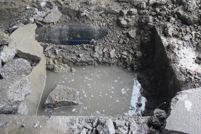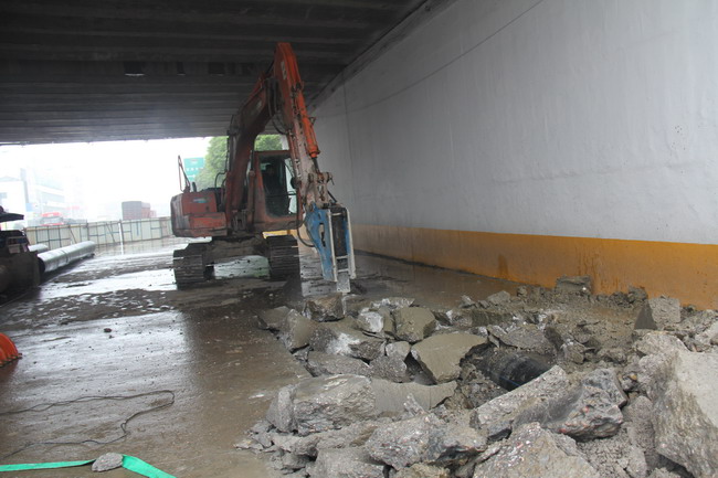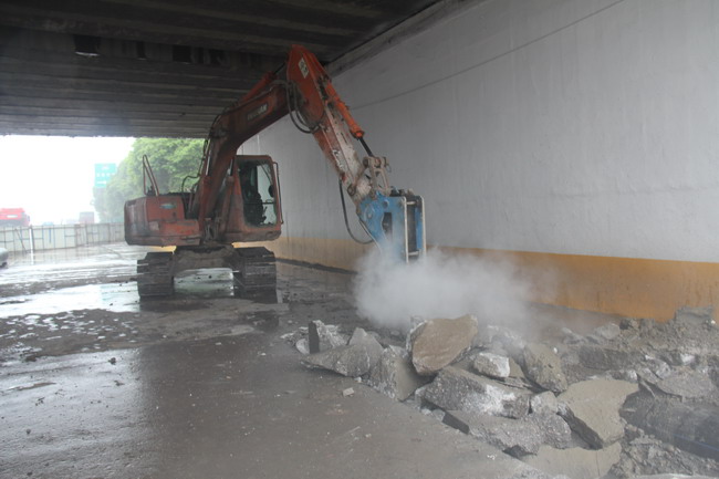 20日上午,天虽然下着大雨,但在东方大道与沪渝高速交汇处的桥洞现场,却一片忙碌景象,只见桥洞前后设置着鲜艳的交通警示标志,对来往车辆实行导流,向左边桥洞安全通行。右边桥洞下,水务集团的施工人员身着反光服正在不停的忙碌,挖掘机对路面进行开挖,发出声声轰响,不远处整齐摆放着防腐完成的钢管,等待沟槽开挖完毕后进行安装。据现场负责的项目经理黄凯亮介绍,东方大道全线铺设的是PE供水管,在沪渝高速桥洞下方的管道因桥台基础高度受限,管道埋深较浅,同时遭遇大型重载车辆的长期频繁辗压,开始发生渗漏现象,为确保供水安全,此次管改将对该段近128米管道进行更换,重新安装耐压的钢管,钢管安装后采用细砂回填,并在管顶采用C30钢筋混凝土封层还原,从而提高管道的抗压能力。