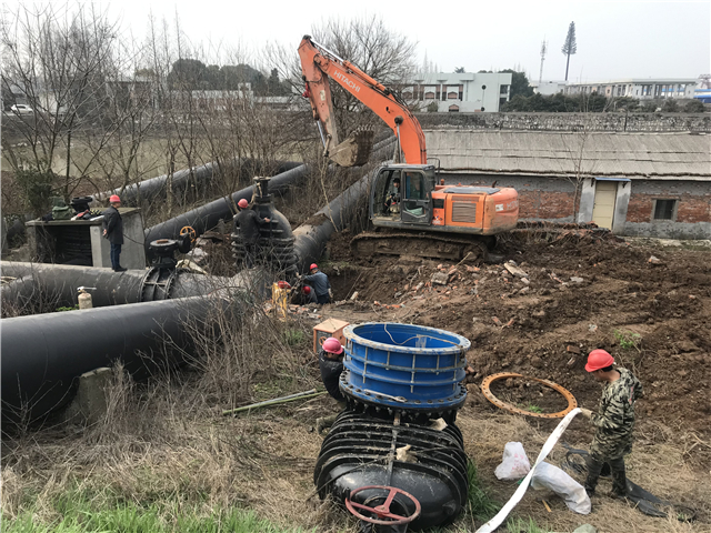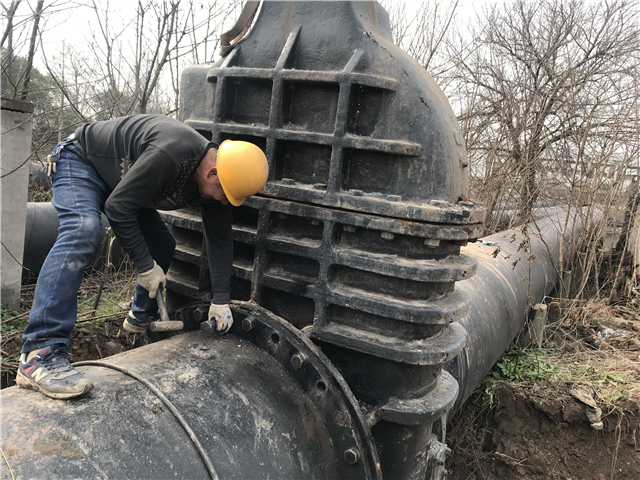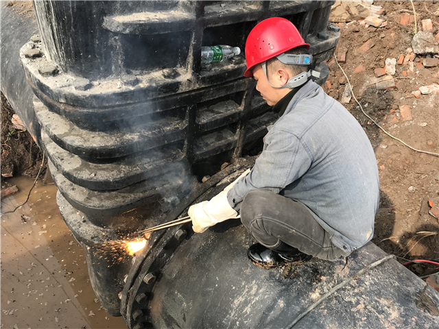 故障阀门拆除后,旋即着手新阀门的安装。由于新闸体积较原阀小了许多,因此还必须在连接处焊接一根50厘米左右的伸缩器。作为重要环节,为确保连接处严丝合缝,焊接过程必须做到分毫不差,电焊师傅们站在齐腰深的水坑里弯着腰进行焊接,尽管火花四溅,尽管衣服已全部淋湿,尽管一弯就是1个小时,但他们却不敢有片刻的放松。