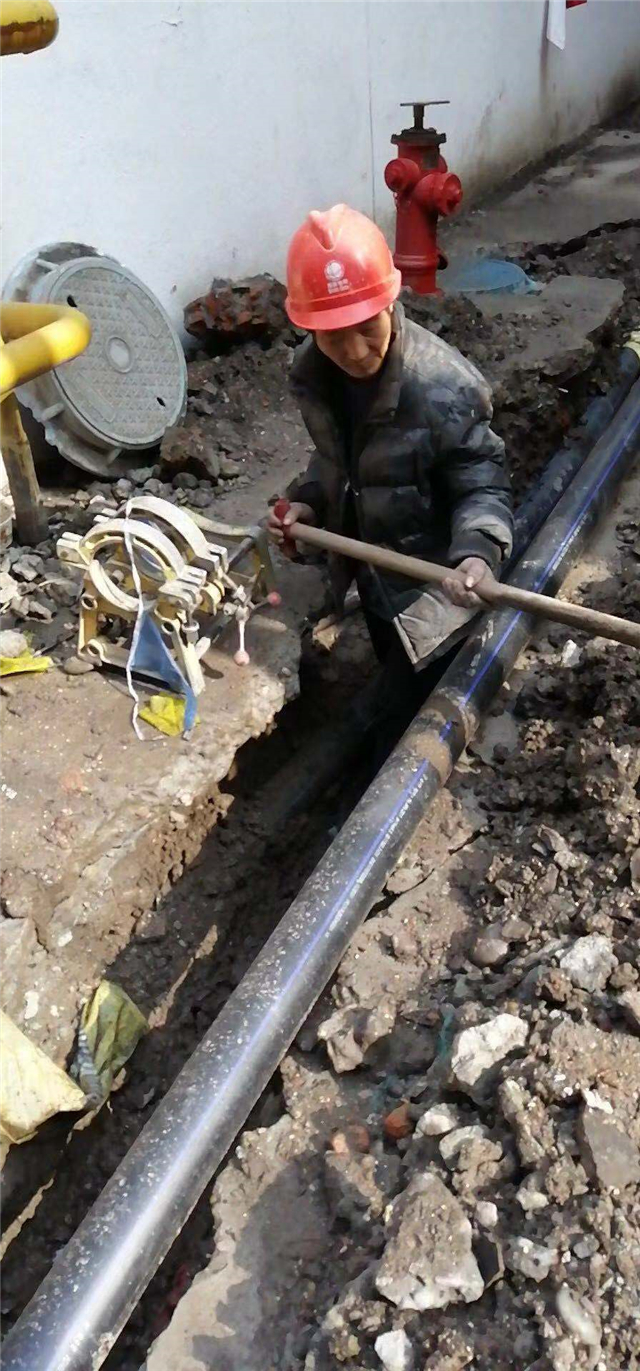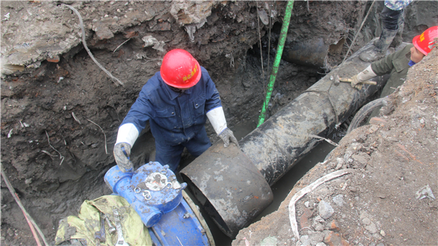 为最大限度缩减停水时间,施工人员对该5处安排同步进行施工,虽然工程难度不大,但对现场人机料的合理调度提出了较高的要求,为此湖北鼎鑫源工程公司项目部结合现场实际情况,编制了周密的施工计划。考虑现场电焊作业量较大,本次共抽调了焊工13人,施工员19人,任务落实到每个点每个人。21日前,大家便完成了这5个点管网接头处的开挖工作,提前制作好了钢制件,设备材料也提前进场,并在施工现场周围设置了围档与安全标识,为工程的顺利进行做足了准备工作。