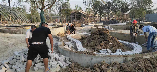 1、园路开挖及碎石回填、园区青瓦地面已经开始铺装;