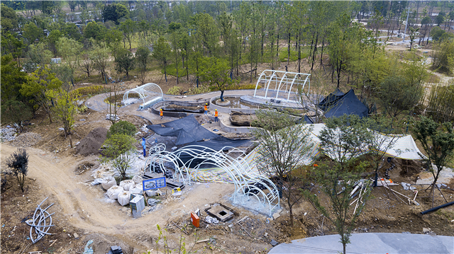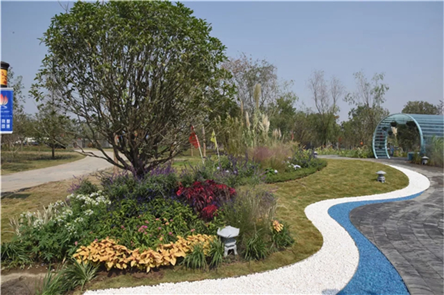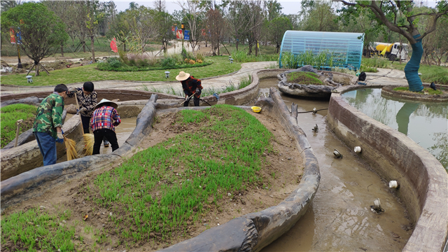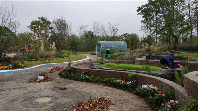 绿化部分完成:水生植物栽植,云盆内播撒麦籽,苗木已基本栽植完毕,撒树皮覆盖绿化土,整理展园附近公共区域绿化;
