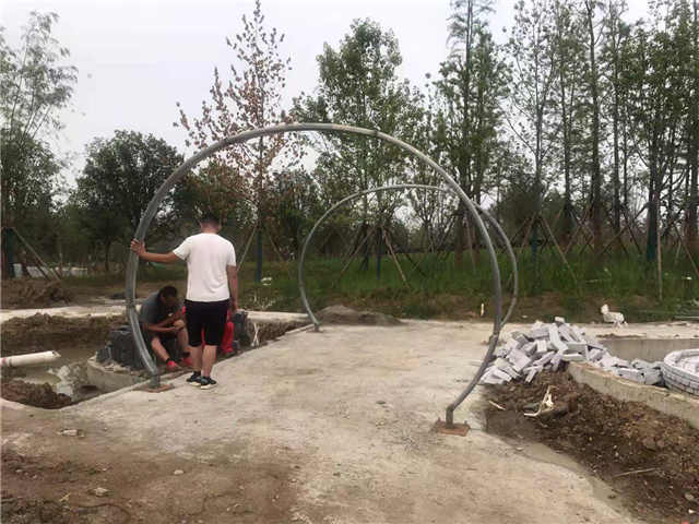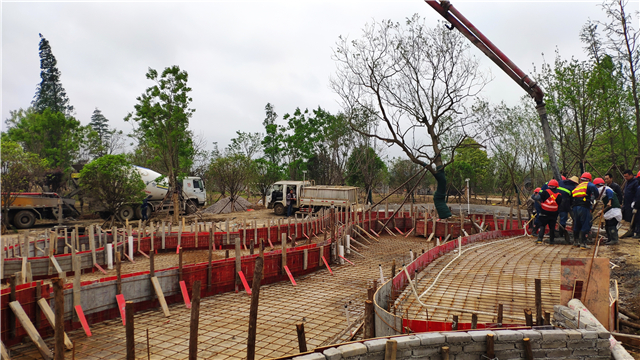 4、水中云盆底板已制好模板置入钢筋准备倒混凝土,大门、展厅、休息亭基础浇筑完成,展厅钢构件已安装完毕、休息亭钢结构安装完成60%,主入口大门处已预埋雕塑大门底座连接件,部分钢构件已入场安装。