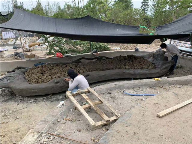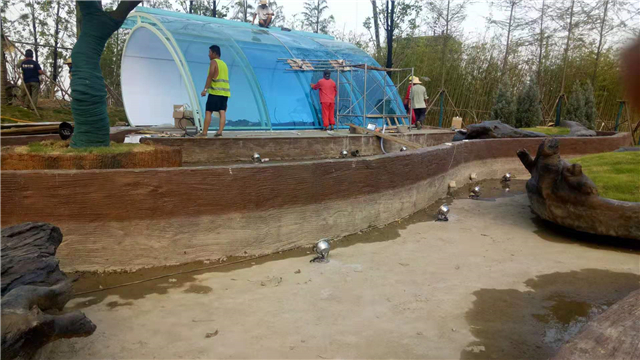 3、云盆砖砌结构及造型完成,混凝土悬浮底板浇筑完成,加高整改云盆及池壁低于水位的部分,装饰抹灰完成,饰面碳化木颜色油漆完成70%;