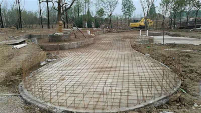 绿化部分完成:园路土方整形、开始种植乔木。