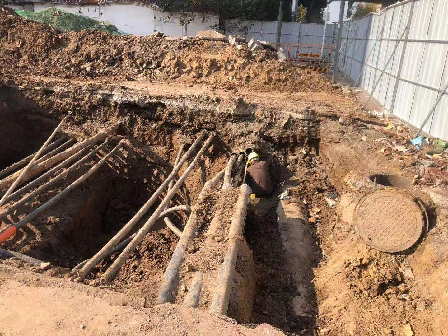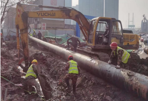 为配合太岳路(荆江大道至河滨路)道路工程建设,需对太岳路与南湖路交汇处长48米DN600mm的水泥管进行更换。应政府要求,该道路建设工程需在年前完工,时间紧任务重,鼎鑫源工程公司接到任务后,立即派人前往踏勘。经勘探,现场施工环境极其复杂:地面以下,在给水管位南侧穿插着9根110千伏高压线,北侧被下水管及过路通讯光缆管位占领着,西侧更是铺设着国防光缆,地面以上还屹立着一根电杆;且施工地段位于车流量较大的主干道,作业面狭窄,管位紧张,施工难度极大。