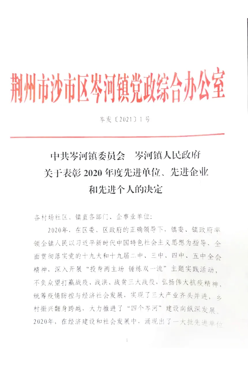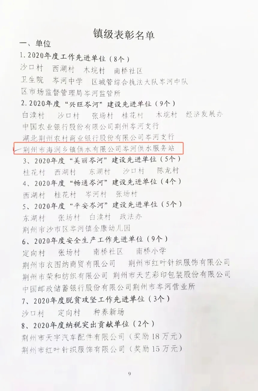 近日,岑河镇人民政府表彰了2020年度大力推进“四个岑河”建设的先进单位、企业及个人。荆州市海润乡镇供水公司岑河供水服务站荣获2020年度“兴旺岑河”建设先进单位。