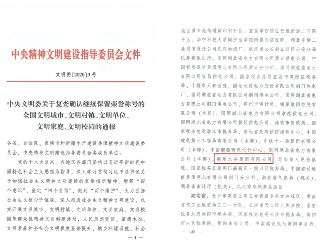 近日,中央文明委印发《关于复查确认继续保留荣誉称号的全国文明城市、文明村镇、文明单位、文明家庭、文明校园的通报》,荆州水务集团再次顺利通过全国文明单位复评,此次复评是荆州水务集团自2005年以来连续六届(2005年、2008年、2011年、2014年、2017年、2020年)荣获“全国文明单位”称号!
