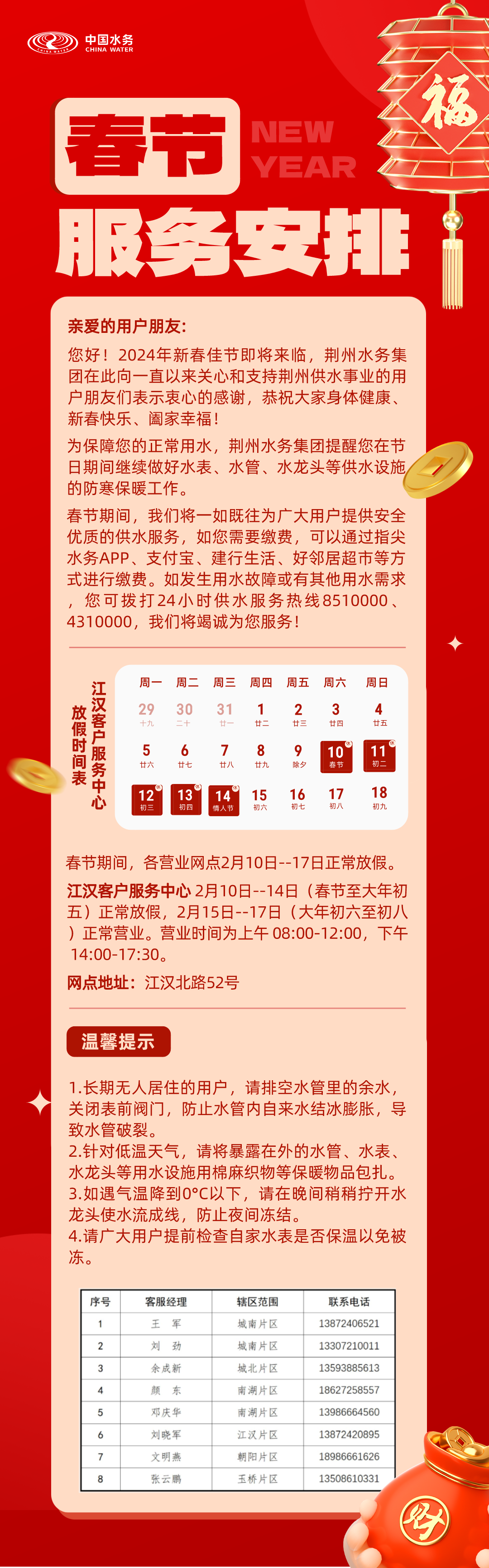荆州水务集团2024年春节假期服务时间安排