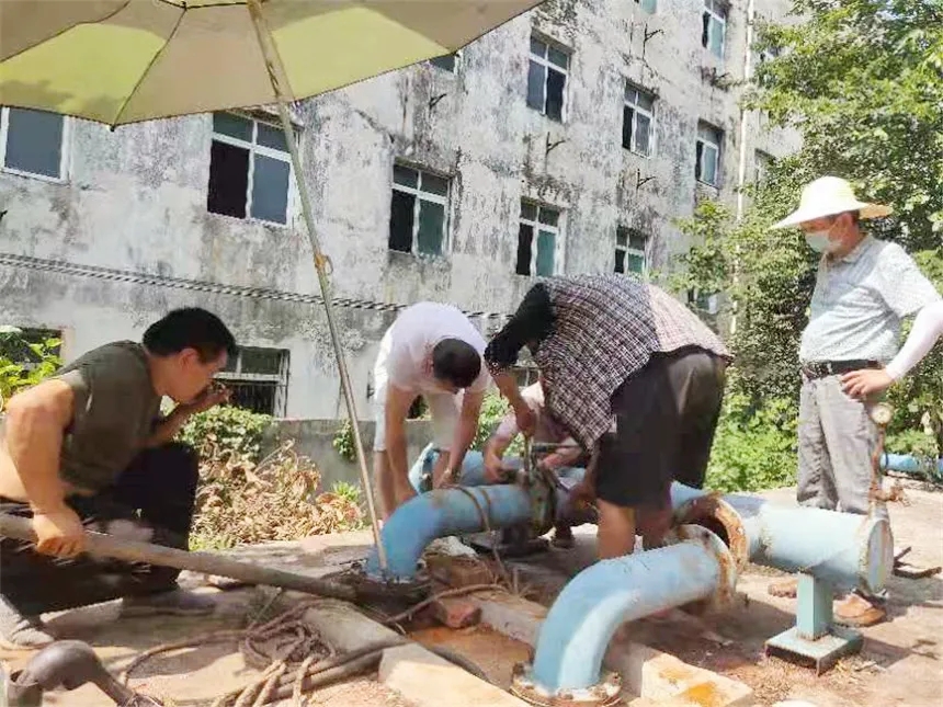 为了尽快给隔离点恢复供水,滩桥供水服务站立即组织工作人员投入战斗。烈日炎炎下,大家众志成城,肩挑手抬,持续奋战16个小时,完成了对旧设备的拆除、清水库的排水及清洗、消毒、杀菌工作。次日,两台18千瓦的水泵安装到位,调试成功,并对老旧水管分别进行了封堵和更换,同时也为隔离点工作人员的办公场所重新安装了一条自来水管。