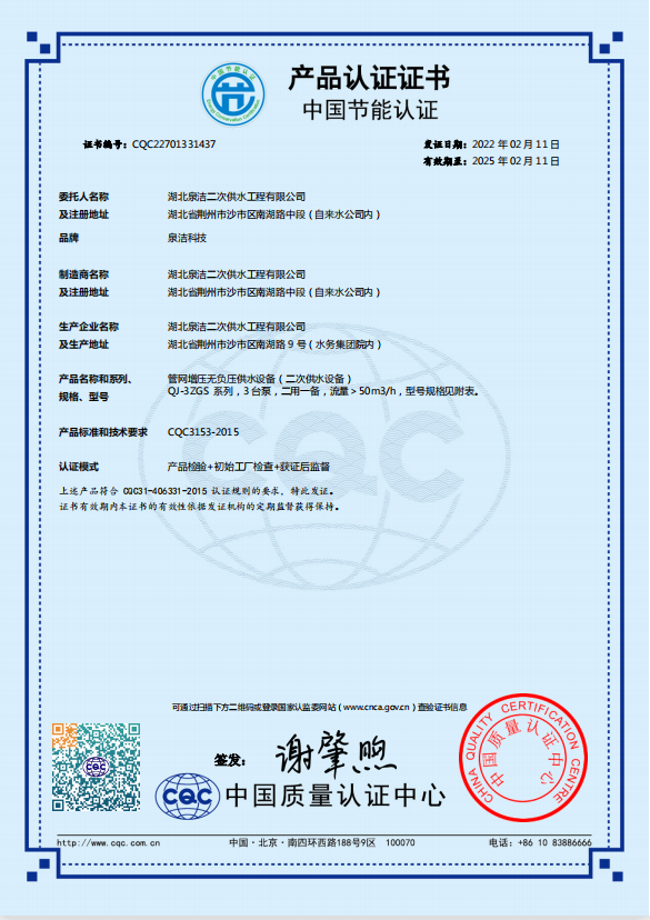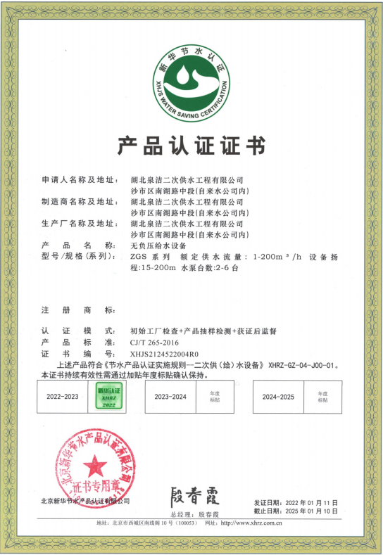 近日,湖北泉洁二次供水工程有限公司传来喜讯,顺利通过了“新华节水认证”及“CQC中国节能认证”,并拿到了两证证书,这代表着泉洁公司生产的二次供水设备达到了我国该行业质量、安全和环境的标准要求,其技术也与同等行业产品认证同步。