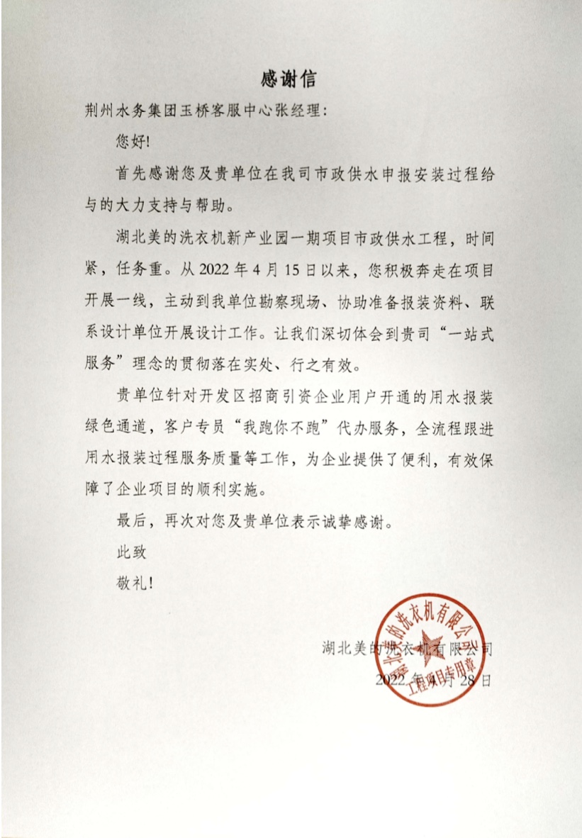 “没想到从申请报装用水到通水,只用了短短的3天时间,水务集团的服务效率和态度真是好!”美的洗衣机工业园负责人激动地说道。