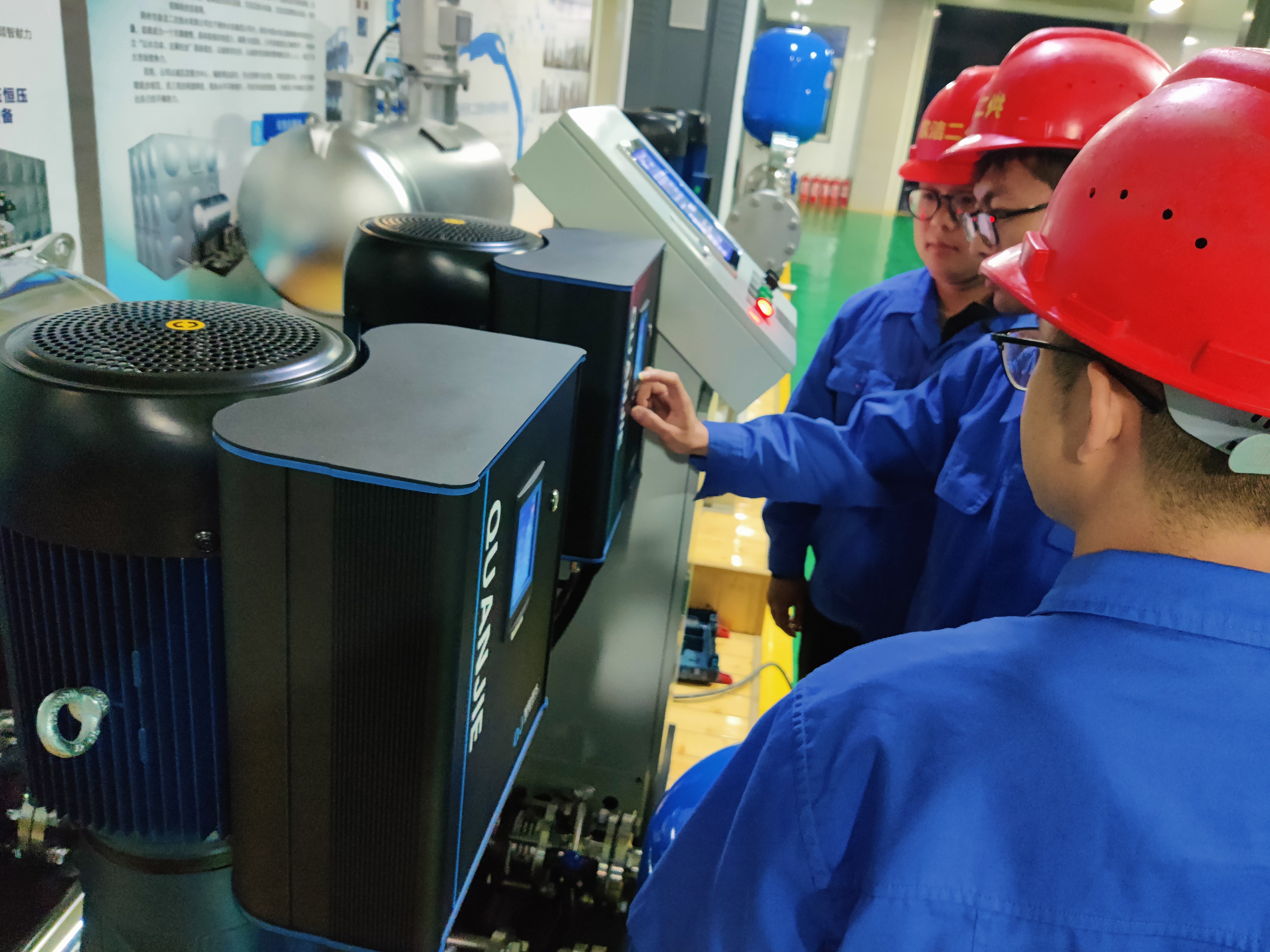 当今之世,科技创新能力成为企业实力最关键的体现,也是一个企业立足于市场的根本。泉洁二次供水工程有限公司作为专业从事二次供水的企业,见证了二次供水的发展史。从最开始传统的高位水箱供水方式,到气压罐加压的供水方式,再到变频技术的应用——恒压变频供水设备,并在此基础上经过技术改造,第四代无负压恒压供水设备从而应运而生。每次的更新换代象征着二次供水的技术革新,泉洁公司也不甘落后,现为迎合市场研发出了新型背负式恒压供水设备。无负压恒压供水设备虽然在供水稳定性、安全性、和经济性上有着诸多优点,但是现在也存在着很多待改进的地方。例如像占地空间较大,使用的电气元器件较多等缺点。针对无负压设备的一些短板,在研发背负式恒压供水设备时,我们着重解决了变频器和电气元件的摆放设计与电气集成,使之具备多泵冗余、流量估测和高低水压保护等智能化功能,以及高能效、低噪音、省电柜等优点,是泉洁公司落实智能制造、深悉用户需求的体现。