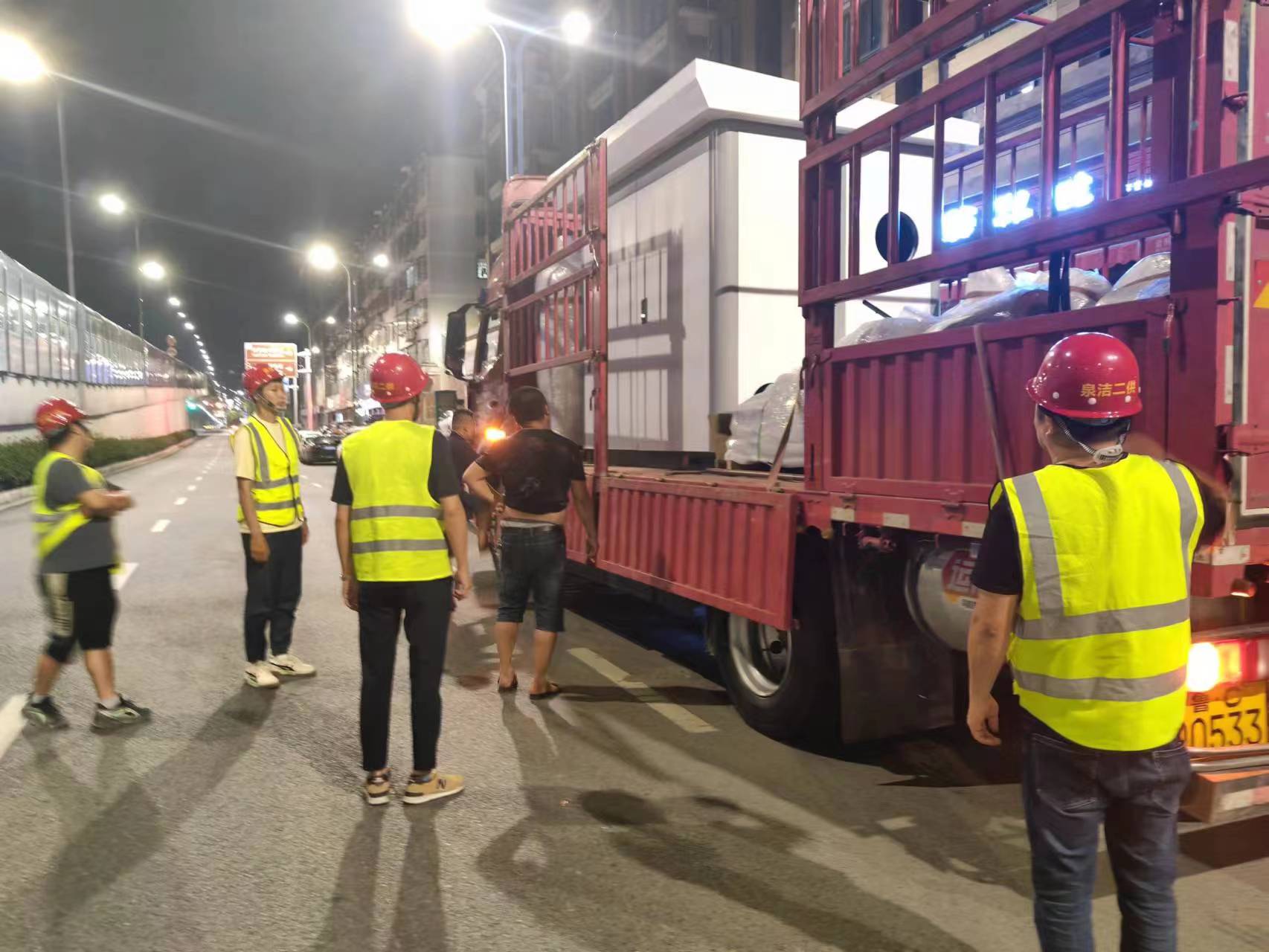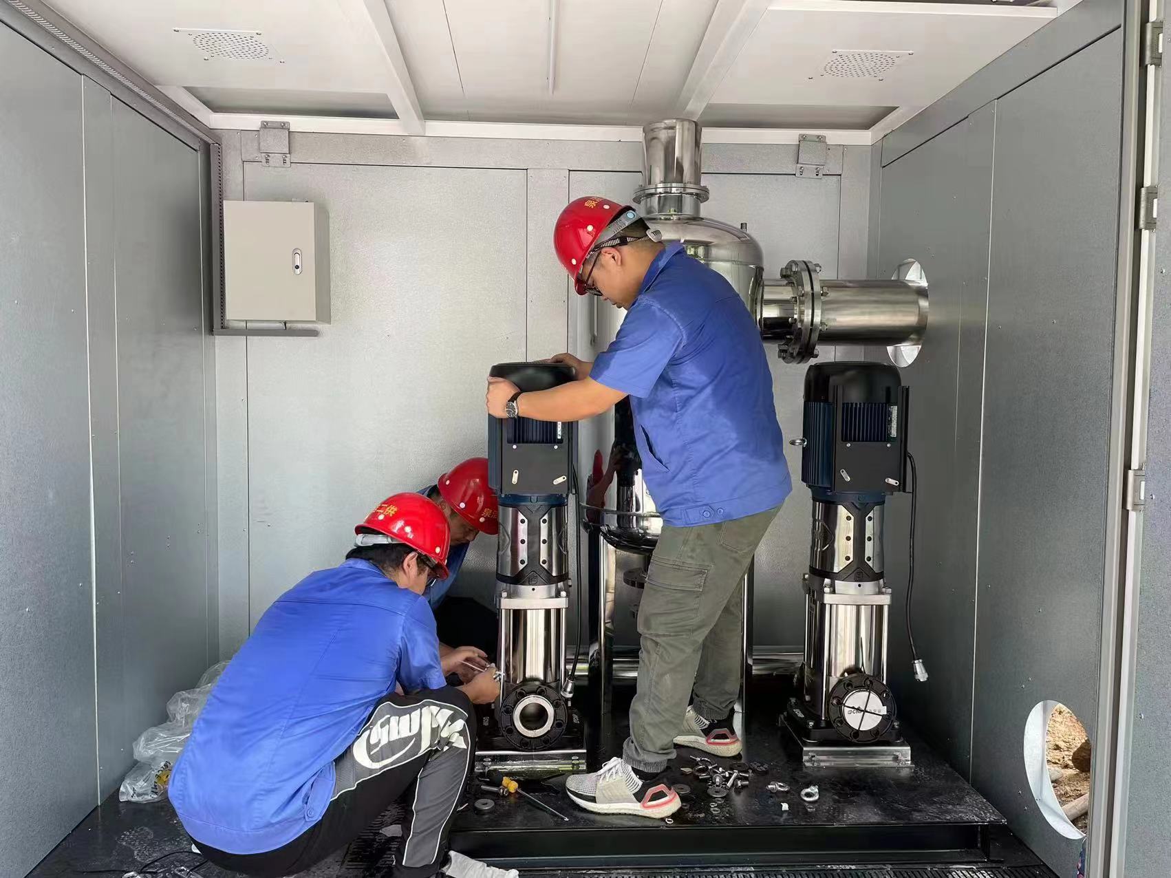 眼看夏至已至,居民用水需求将会逐日递增,荆州水务集团一日也不敢耽误,各司其职,只待“定制”的泵房到来。在6月22号晚上21点,已工作一天的工程技术人员们耐心地在路边等待,汗水止不住地从他们身上往下流,当看到托运的货车缓缓驶来时,只听施工员徐大强大喊一声:“开始干!”,大伙便鼓足精神,一鼓作气配合叉车师傅把“定制”的泵房摆放到位。第二天就早早开始了一体化智慧泵房的设备调试工作。但奈何天公不作美,白天工程技术人员们顶着酷热,汗流浃背装配设备及安装管道。傍晚便开始下大暴雨,不知身上是汗水还是雨水,早已不知疲惫的他们继续进行设备的调试工作,只为让银都花园小区居民尽早用上安全放心的“加压”水。