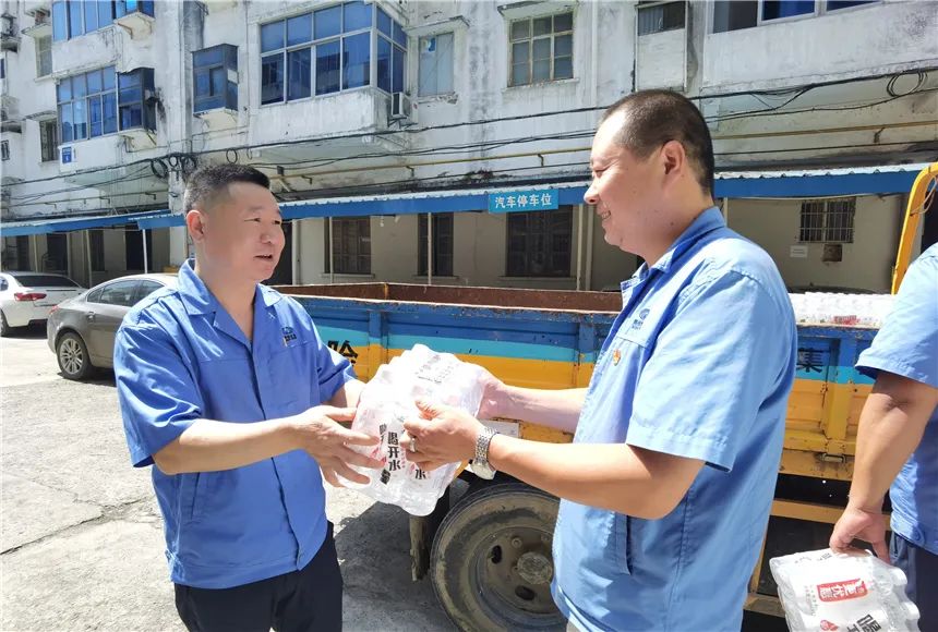 在柳林水厂,副总经理葛世玉和曾兵为厂区干部员工送去了矿泉水、清凉油等防暑慰问物资,询问制水厂安全运行、供水水量、防暑降温等方面的工作情况,鼓励干部员工发扬吃苦耐劳的优良作风,做好安全生产和高温天气供水保障工作。