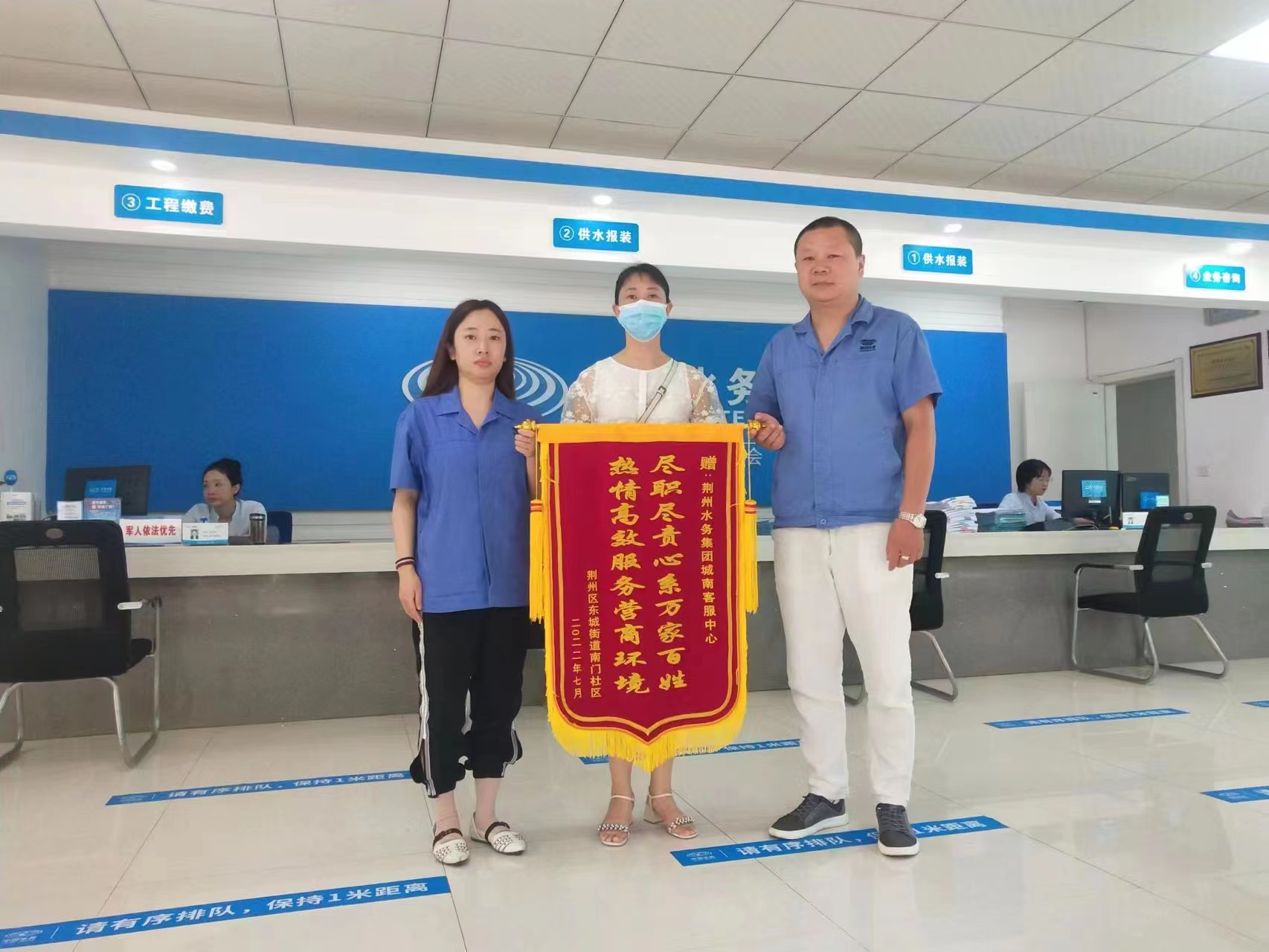 13日上午,荆州市南门社区社区主任带着写有“尽职尽责心系万家百姓 热情高效服务营商环境”的锦旗来到荆州水务集团客户服务部,感谢城南客户服务中心为解决原南门中学院内管漏与分户工作作出的努力,彭主任不住地说:“真是感谢你们为优化营商环境作出的贡献!”