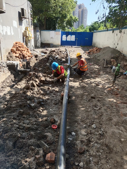 在朝阳路西片区老旧小区管网改造的施工现场,就有数十名施工员们正在工地上挥汗如雨。为赶在九月一号开学前完工,让学生们的上学之路有一个干净整洁的街道,让朝阳街道西片区的市民早日用上健康放心的自来水。他们正马不停蹄地对老化锈蚀的铸铁管道进行封堵废除,更换为PE材质的给水管道,并对水表井移位,重新砌筑安装。