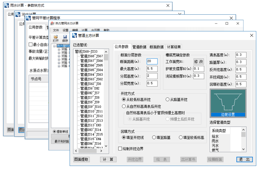 管立得还支持各类专业的管道计算,如雨水计算、污水计算、管网平差计算、管道土方计算等。在进行给水规划时,可以利用管网平差程序省去繁琐的计算过程,通过分配节点流量和管径,使设计的给水管道能够保证最不利用水点及消防用水等需求,并相互校核,确保数据的科学性。在数据的支持下进行经济技术分析与比较,最后确定最佳方案。