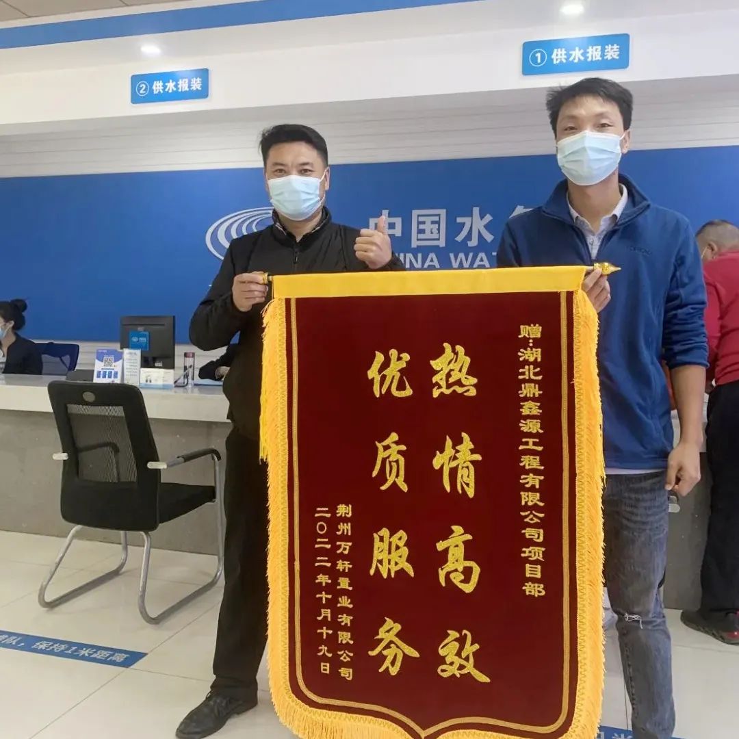 近日,湖北鼎鑫源工程有限公司收到了来自荆州万轩置业有限公司的一面锦旗,对鼎鑫源工程公司快速高效完成施工任务、快速解决用水问题表示感谢。“热情高效,优质服务”8个烫金大字,表达了用户对鼎鑫源工程公司项目部及时服务、专业技术的高度赞扬。