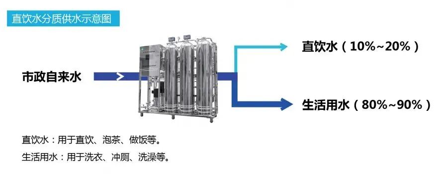 答:分质供水又称“双路供水”,按照水的用途,分管道供应,从而让人民都饮用优质直饮水;大量的生活用水用自来水,冲厕等用中水回用等。分质供水,使水资源各得所用,在水资源有限、成本合理情况下,提升居民生活品质。