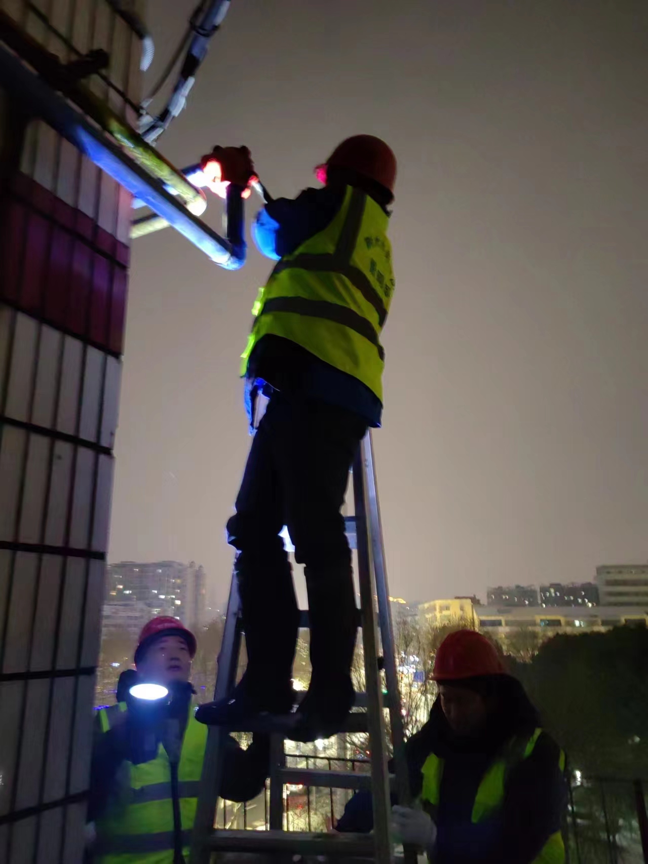 “叮叮叮”,电话声响起,抢修员接到用户求助——文湖花园小区2号楼管道漏水,还来不及返回公司,抢修员们随即调转方向奔赴下个战场。漏水点位于三楼户外平台的风口,管道被冻裂后在不断流水,维修需要搭梯登高上去。此时夜幕开始降临,气温低至零下4度,而维修的“高处”更是不胜寒,风吹在脸上象刀刮,抢修员们的手冻僵了,呵一口气、搓几下手后继续工作,大家默契地配合着,有的拿灯照明,有的扶梯传递工具,抢修员站在梯子上专注工作,似乎忘记了危险与寒冷,直到顺利完成后才松了一口气。