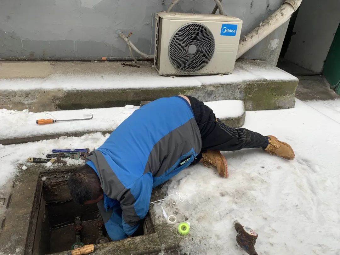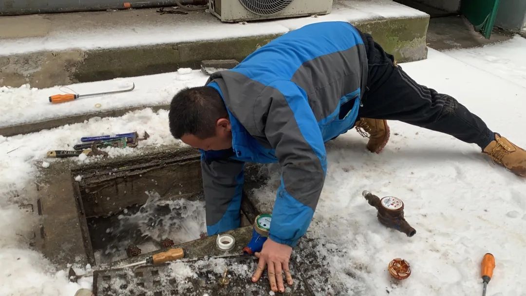 水表箱位于小区北风口处,水表玻璃面板已经冻破,水从破损的表面和阀门连接处喷涌出来,只见陈劲鹏师傅单膝跪地,弯腰下俯用扳手快速地扭动着水表接口,刺骨的水花四处喷射,陈师傅脸上、衣服上、袖口上溅湿的水花,在低温的户外瞬间结成了薄薄的一层冰花。水表拆下来后李刚师傅赶紧递上新的水表,陈师傅快速进行安装,在两位师傅默契的配合和娴熟的操作下,水表装上了,阀门打开了,用户家中通水了。而师傅们的双手因为全程浸泡在冰冷刺骨的雪水中,早已被冻得通红失去知觉,跪地下俯的双腿也已麻木难行。当问到陈师傅冷不冷时,陈师傅感慨的说:“虽然身上冷,但心里是热的”。