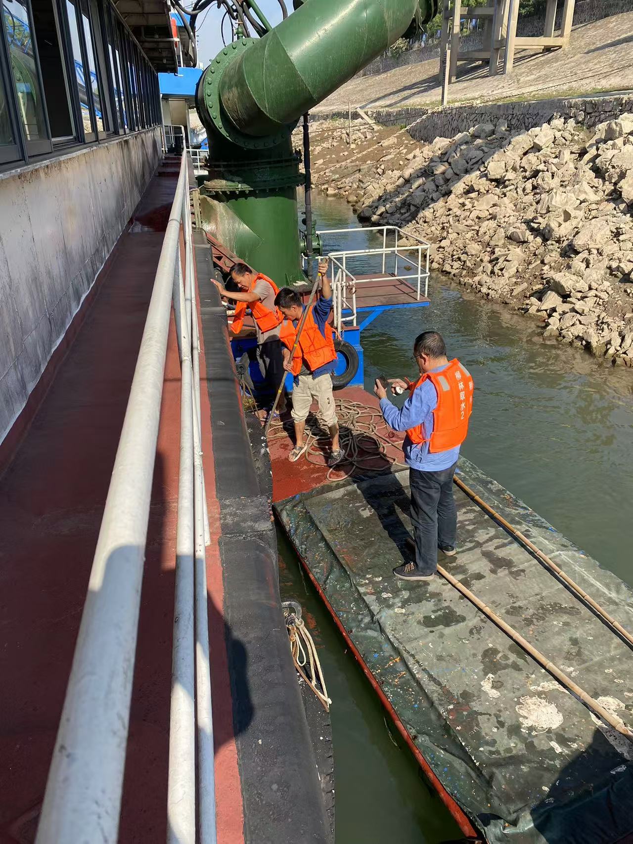 面对枯水期的到来,为确保取水泵船安全运行,一方面生产技术部组织专业人员对郢都、柳林、南湖取水泵船水位进行定时水位测量,保障取水效能及安全,另一方面各制水厂加大泵船监测力度,及时调整泵船方向,消除泵船搁浅风险同时安排专人做好冲砂工作。