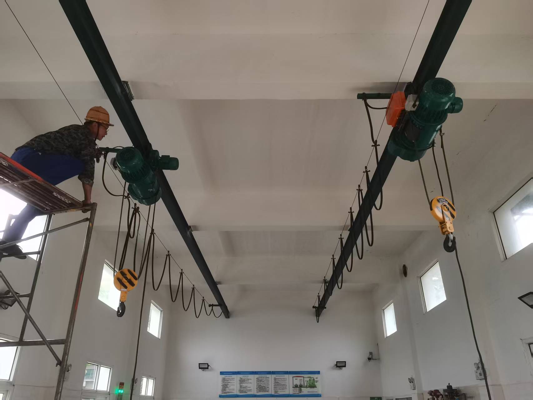 施工过程中,工作人员克服加氯车间作业空间有限、安全要求高等困难,采用专业吊装设备,高效完成旧电动葫芦拆除工作。新设备安装阶段,技术人员严格把控轨道安装精度、部件连接紧固度及电气系统调试等关键环节,确保新电动葫芦的起升能力、运行稳定性及安全防护性能全面提升。改造后的电动葫芦配备了智能限位、过载保护等先进装置,有效降低设备故障风险,为加氯作业提供更可靠的设备支持。