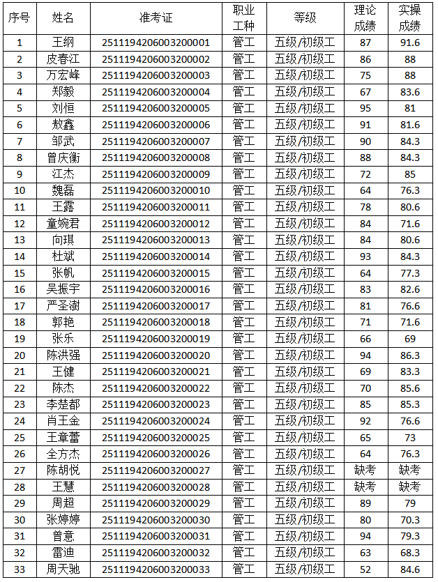 由荆州水务集团有限公司于2025年11月19日组织的第1批职业技能等级认定考评已经结束,本批次考评工种为管工,共计33人,认定等级为五级/初级。现将成绩予以公示,公示时间为11月21日至28日,公示期内如有异议,可拨打监督电话:0716-8453124 ,联系人:吴曼。