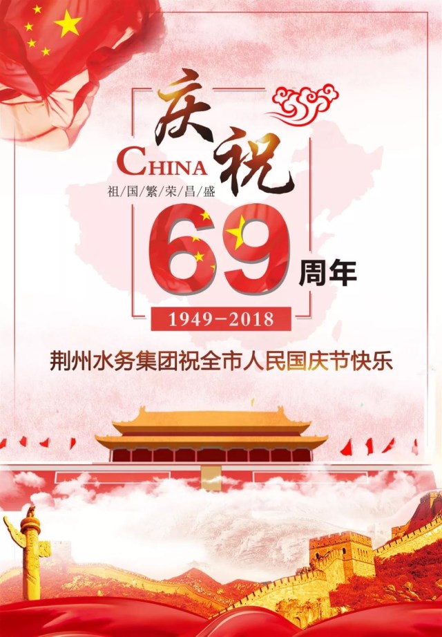 值此国庆佳节来临之日,荆州水务集团640名干部员工祝愿祖国:风调雨顺、繁荣昌盛、国泰民安、生日快乐!