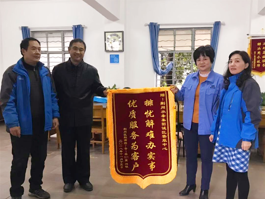 11月15日,荆州市公安局宿舍小区的周铁来到城区客服中心,将一面“排忧解难办实事 优质服务为客户”的锦旗送到部门负责人手中,并感激地说道:“谢谢你们!谢谢你们解决了长期困扰我们的用水难问题!”