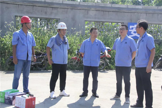 在城北新区纪南水厂施工现场,副总经理葛世玉、总经理助理曾兵听取了项目经理黄凯亮对工程建设情况的汇报,葛世玉强调了高温期间,一定要做好施工人员的防暑降温工作,要采取避峰作业等方式,在确保人员安全的情况下大力推进重点工程建设,曾兵对在场建设人员进行慰问的同时,再次提醒了施工人员一定要注意人身安全。