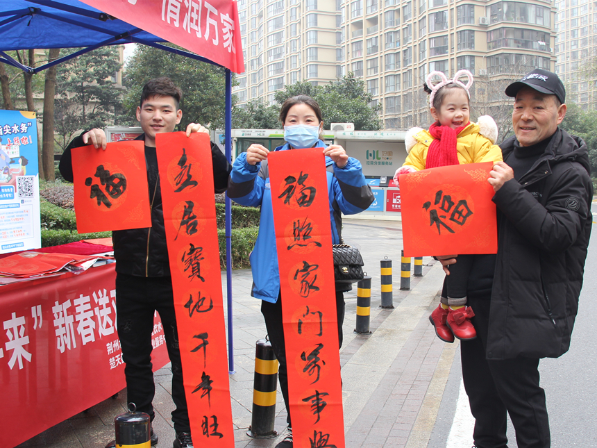 一幅幅喜庆的春联,一张张开心的笑脸,组成了温馨和谐的美好画面,一上午的时间,荆州市心泉净水技术服务有限公司共为小区居民送出春联100余幅,让大家提前感受到了欢乐祥和的新年氛围。