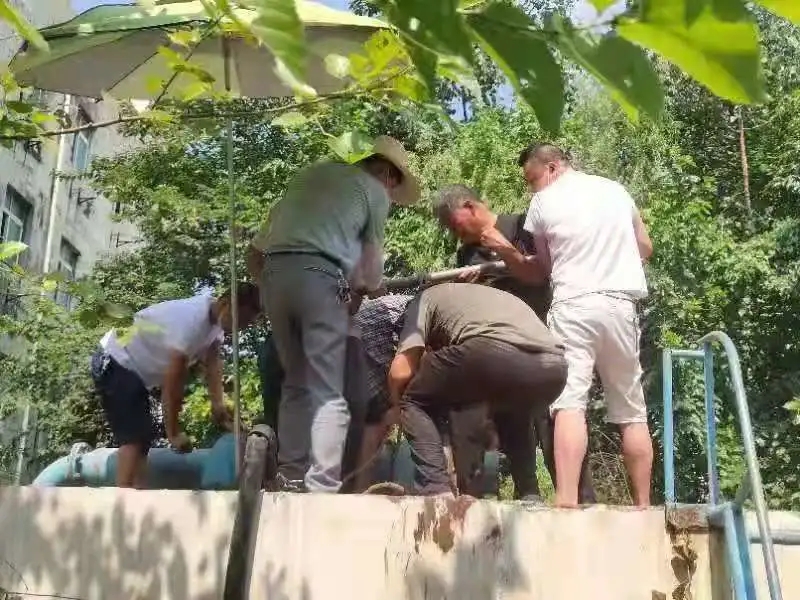 2021年8月2日,星期一,疫情突起,荆州市新冠肺炎防疫指挥部将沙市区部分区域划定了中风险地区,事态紧急,滩桥镇镇委、镇政府迅速启动应急预案,同时,决定把原滩桥高中两栋闲置多年的宿舍楼作为集中隔离点,亟需解决用水问题。疫情就是命令,防控就是责任。接到通知后,王军同志立即赶赴现场查看,发现供水设备已经完全锈蚀,部分水管老化断裂,根本无法使用。早一天对隔离点恢复供水,就能及早阻断病毒传播的风险。为此,他立即向集团技术部门寻求支持,充分沟通确定方案后,马上组织工作人员投入战斗,明确分工,各司其职,顶着炎炎烈日,在40度的高温灼烧之下,大家众志成城,肩挑手抬,持续作战10个小时,当天完成了对旧设备的拆除、清水库的排水及清洗、消毒、杀菌。