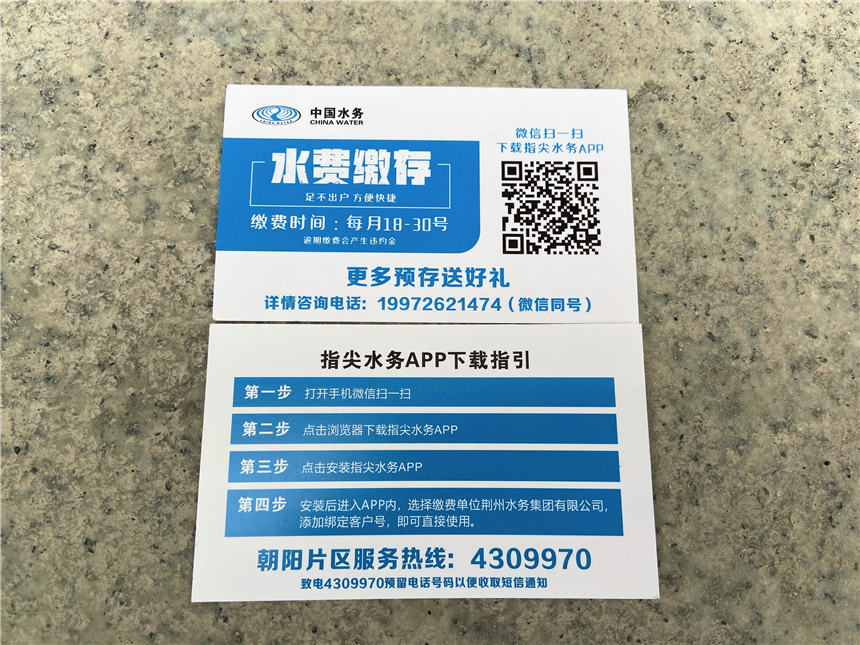 面对欠费的用户,赵磬积极创新工作方法,不仅挨家挨户地贴水费催缴单,还在水费单上附加了自己亲自设计、制作的个人名片。名片上印有下载“指尖水务”APP的详细步骤,并留有个人电话号码和微信,方便用户能够随时随地沟通,提供专业服务。这样一来,既宣传了 “指尖水务”APP,又与用户拉进了距离,增强了用户的信任、理解和支持。