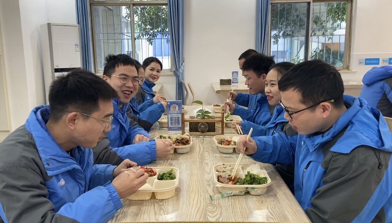 食堂里,职工们围坐在一起,热闹又温馨。大家讨论着新年的愿望,为彼此送上最纯真的祝福。