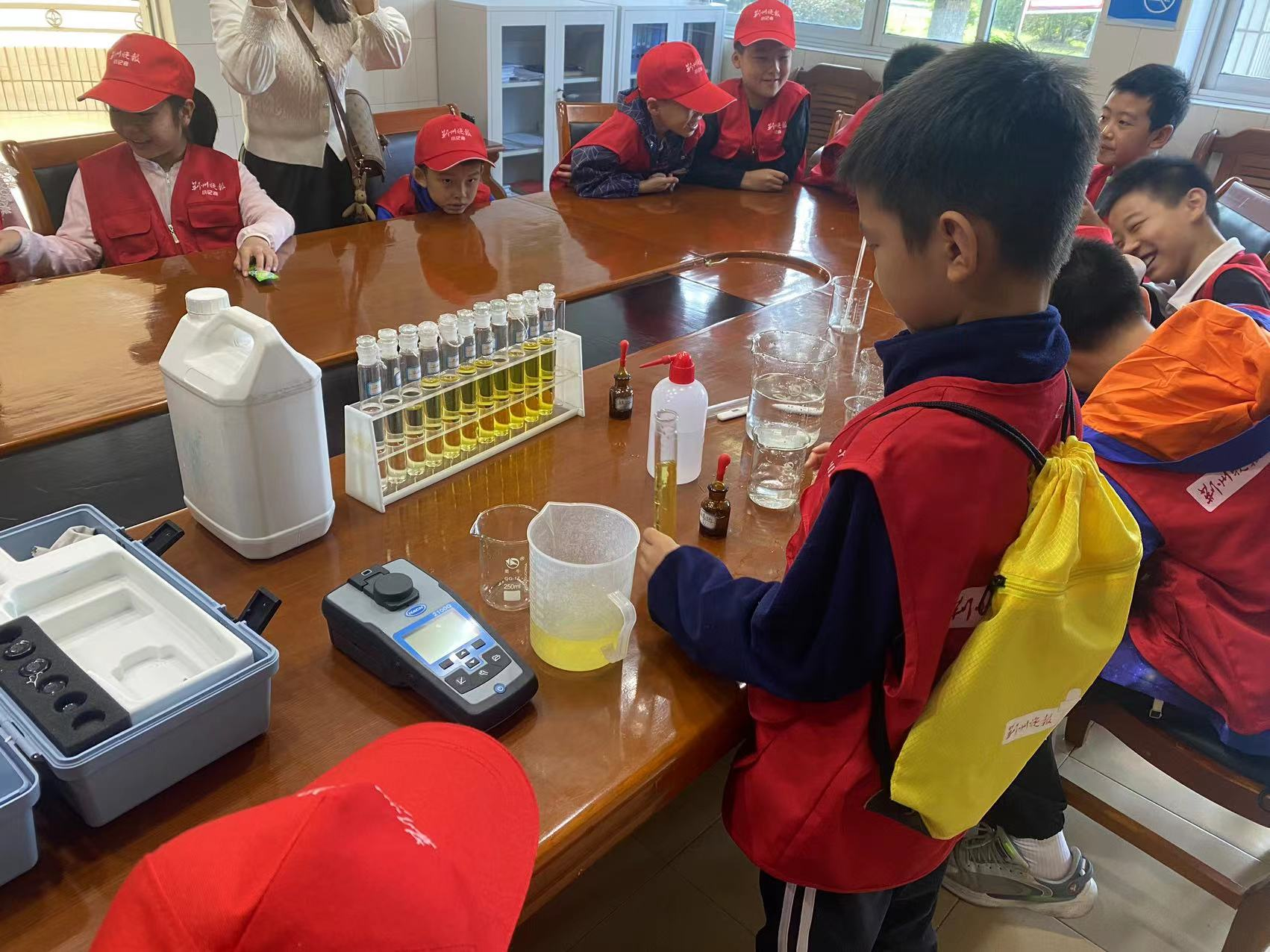 随后,小记者们来到了郢都水厂历史博物馆,了解水厂发展历史,观看相关书法绘画及根雕作品,来自水质检测中心的化验员带领同学们进行了余氯、浑浊度、溶解性总固体的实验,同学们踊跃参与了实验过程,在玩中学、在学中玩,同学们既学到了知识,又在心里埋下了安全用水、节约用水的种子。