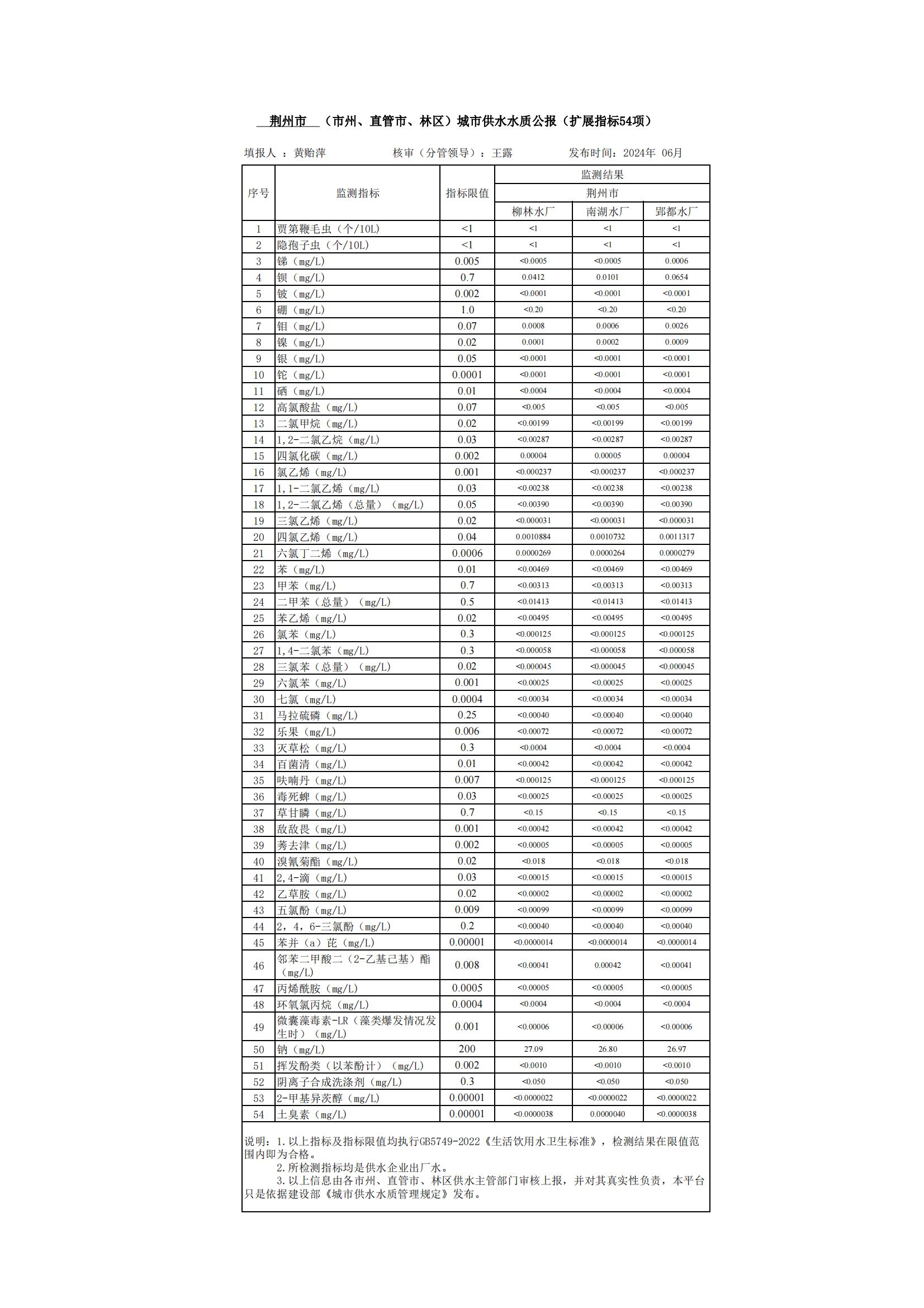 2024年上半年荆州市城市供水水质公报(扩展指标54项)