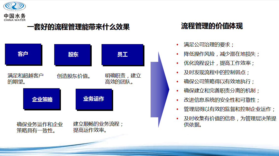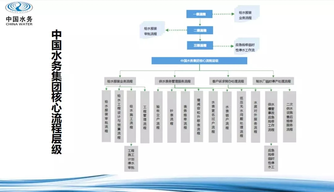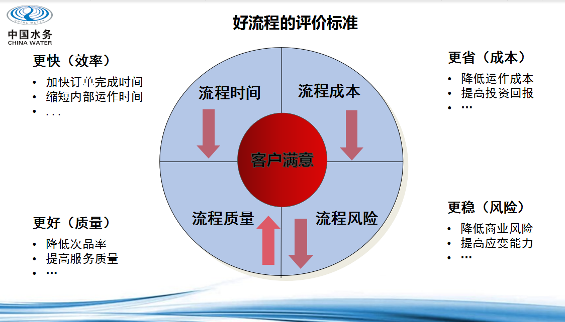 在荆州水务集团,流程管理是服务品牌创建工作落地的一项具体内容。通过实施流程管理,让部门之间、员工之间的权责明晰、打破部门壁垒、降低企业运行成本、提高企业整体效益,达到用户满意,从而大大增强企业的核心竞争力。