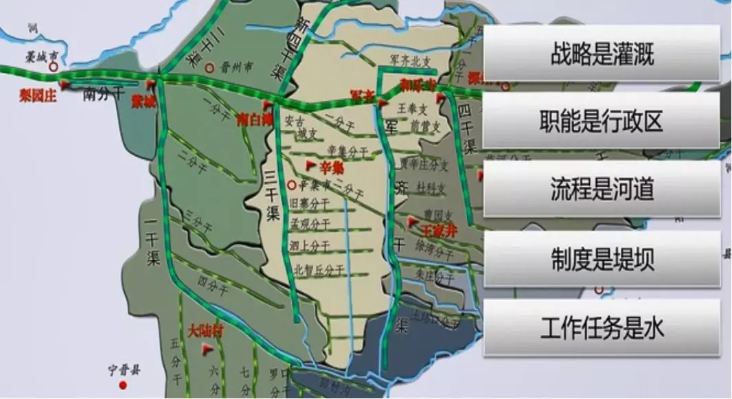 战略是定位,流程是执行。在这张图里,战略是灌溉,它就是靠这些河道来实现的。职能是行政区,不论行政区域怎么改变,这条河道的状态都不会发生改变。如果流程是河道的话,制度就是堤坝。所以流程不会随着组织的变化而变化,它具有相对的独立性,它应该成为企业的最佳视角。