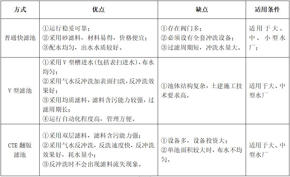 根据上表对过滤工艺的比较,公安园区水厂远期供水规模为9万m³/d,综合考虑,该工程采用V型滤池,该池型为常用形式,过滤效果稳定,出水水质较好,操作管理成熟,而普通快滤池存在阀门多,冲洗水量大等缺点,不适用于本工程。