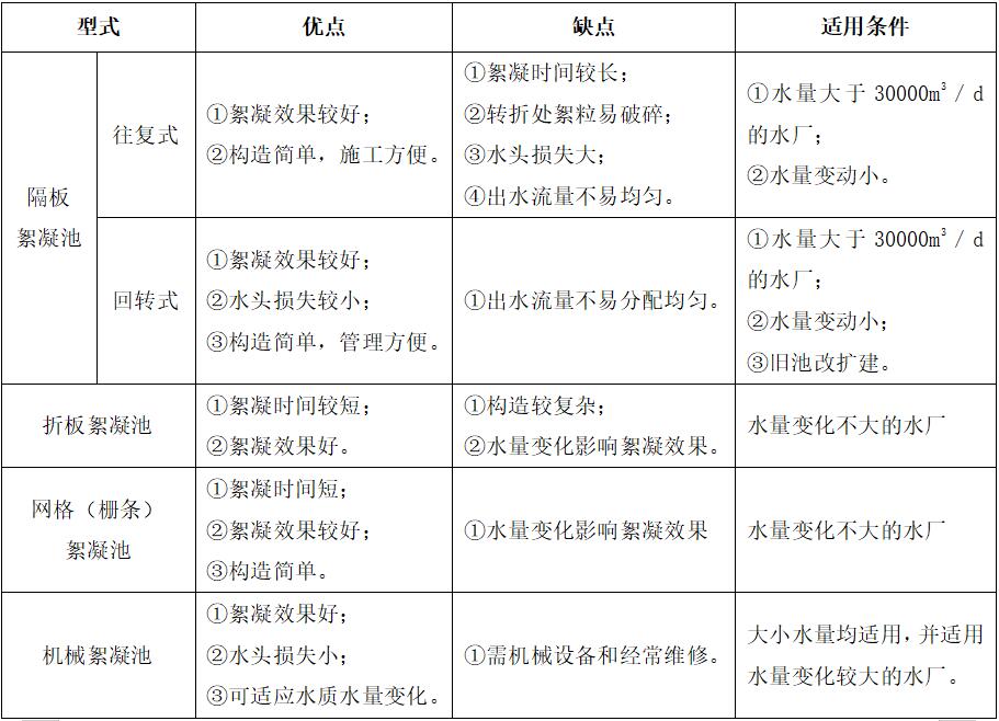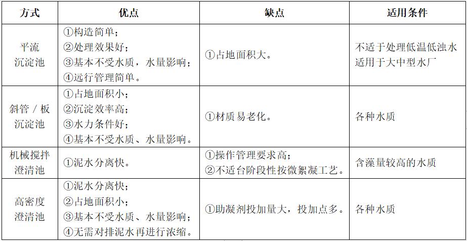经混合、絮凝后,水中悬浮颗粒物以形成粒径较大的絮凝体,需在沉淀或澄清构筑物里分离出来。常见的各种形式沉淀池的性能特点及适用条件如下表: