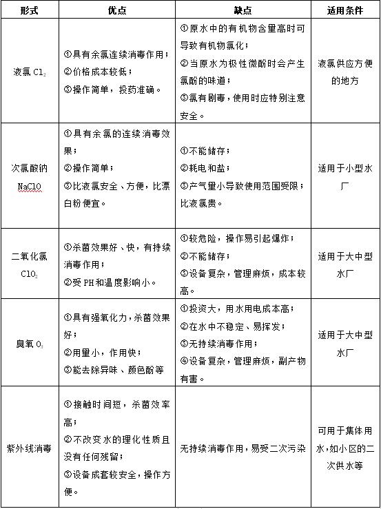 按照《室外给水设计标准》规定,生活饮用水必须进行消毒,通过消毒后,生活饮用水的细菌含量和余氯量应符合国家《生活饮用水卫生标准》的规定,在给水处理中常用的几种消毒方式见下表: