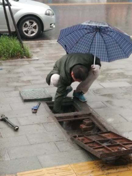 旁边的客户看到水务集团的工作人员如此履职尽责,无不为之动容,有的为他递上了雨伞,希望他能暂时休息一会,可是王军同志仍然一手撑伞,一手坚持工作。