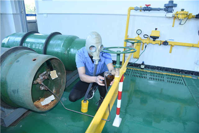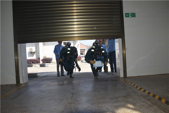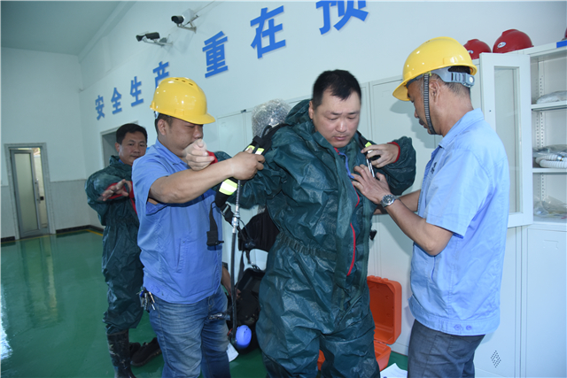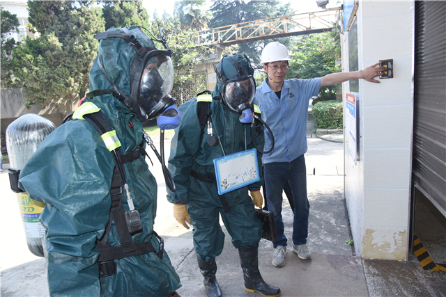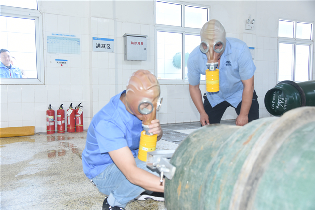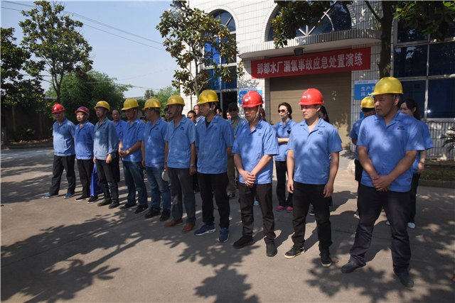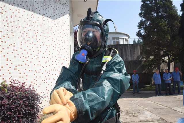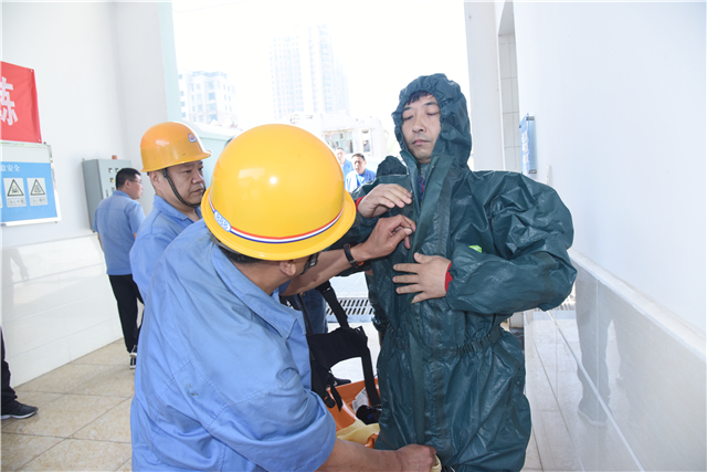5月24日上午9:00,氯气泄漏应急预案的演练在南湖水厂加氯间进行。