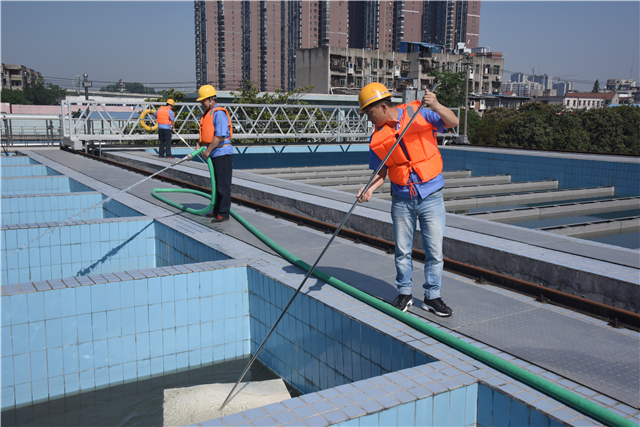 抢险员们有序地开展各项工作,采取关闭取水和送水机组,清洗供水构筑物的应急措施,阻止污染水进入管网。