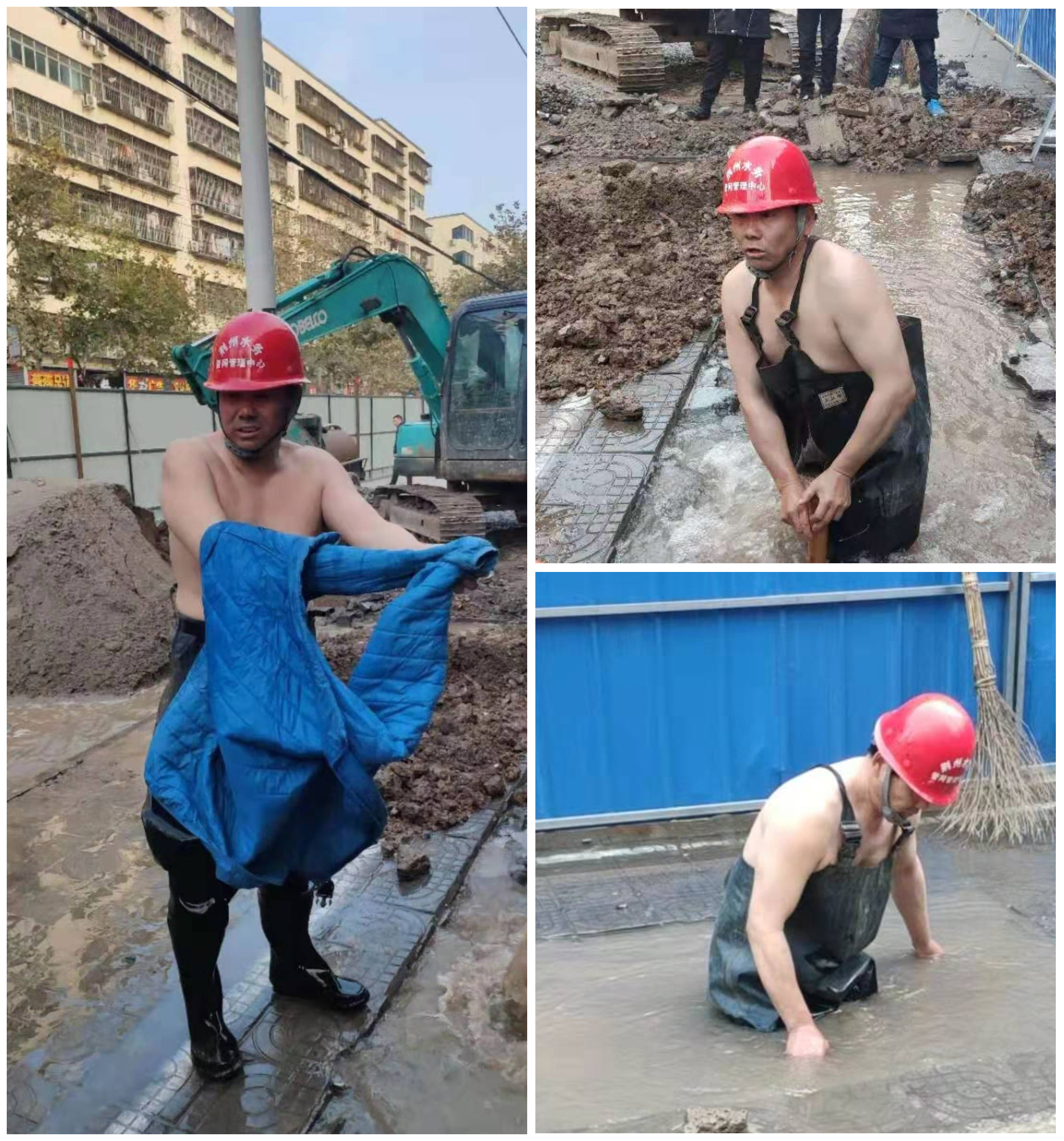 情况紧急,在经过现场制定抢修方案后,抢修二班班长郑伦军主动请缨,建议不停水带水抢修,这样的影响范围最小,最为稳妥可靠,但是对抢修技术要求比较高.老郑说干就干不敢有半点耽误,为了不把保暖工作服弄湿,便于操作,老郑又赤膊上阵穿上了他熟悉的雨裤套鞋跳入冰冷的水中,凭着多年的带水抢修经验,开始一点一点在水中摸索漏点,接着打木屑、上管卡、装阀门…。12月的冬天,气温就只有几度,寒气逼人,大伙穿着棉服在风中都瑟瑟发抖,老郑却打着赤膊在水中一干就是两个小时,为了尽快封堵止水修复管道阀门,身边的同事也同时进行配合用大水泵抽水、递工具。下午6点,经过两个多小时的紧急抢修,此次漏点被成功修复。