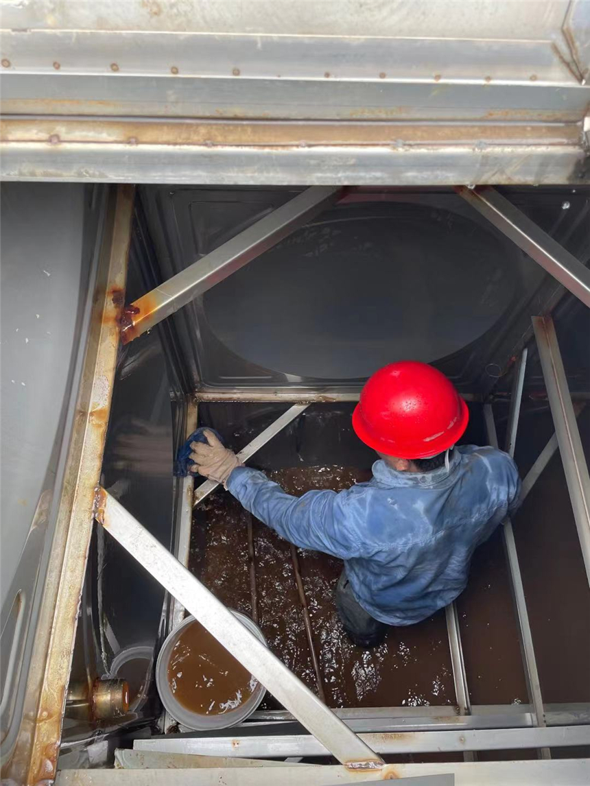 在阴暗潮湿的地下室里清洗水箱,顾不上没过小腿的污水,也顾不上蚊虫的叮咬,得抓紧把水箱清洗干净,用户才能用得放心。