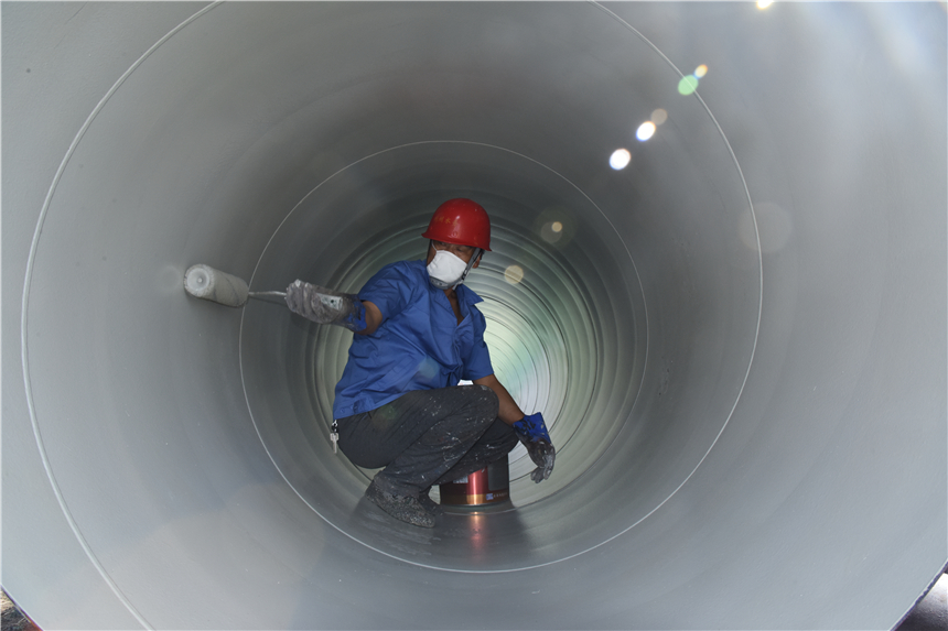 在狭窄的管道内涂刷防腐涂料,钢铁管壁在高温下迅速升温,仿佛置身于偌大的烤箱。